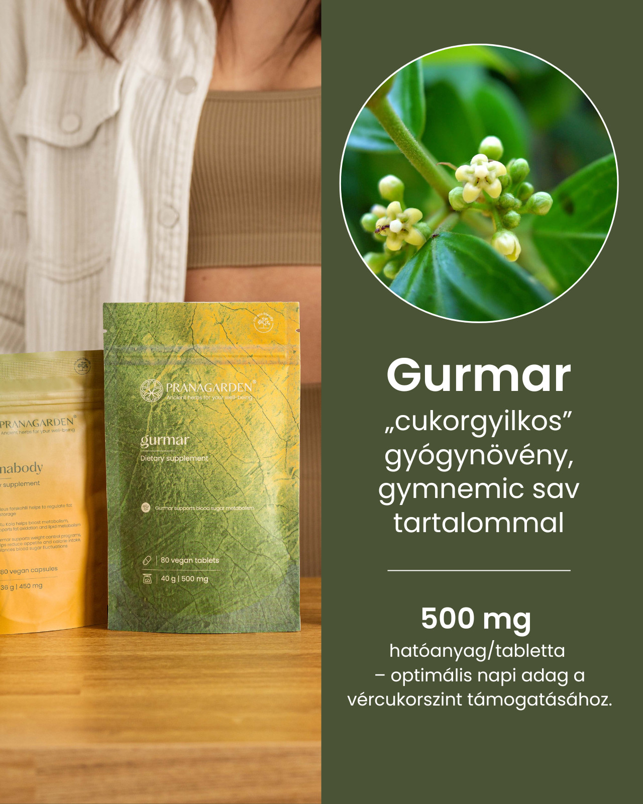 A Pranagarden Gurmar tabletta kizárólag tiszta Gymnema sylvestre gyógynövényőrleményt tartalmaz, etikus forrásból, mesterséges adalékanyagok nélkül. Hatóanyagai támogatják a szénhidrát-anyagcserét és hozzájárulhatnak a vércukorszint egyensúlyának fenntartásához – ami kulcsszerepet játszik az édesség utáni sóvárgás mérséklésében.