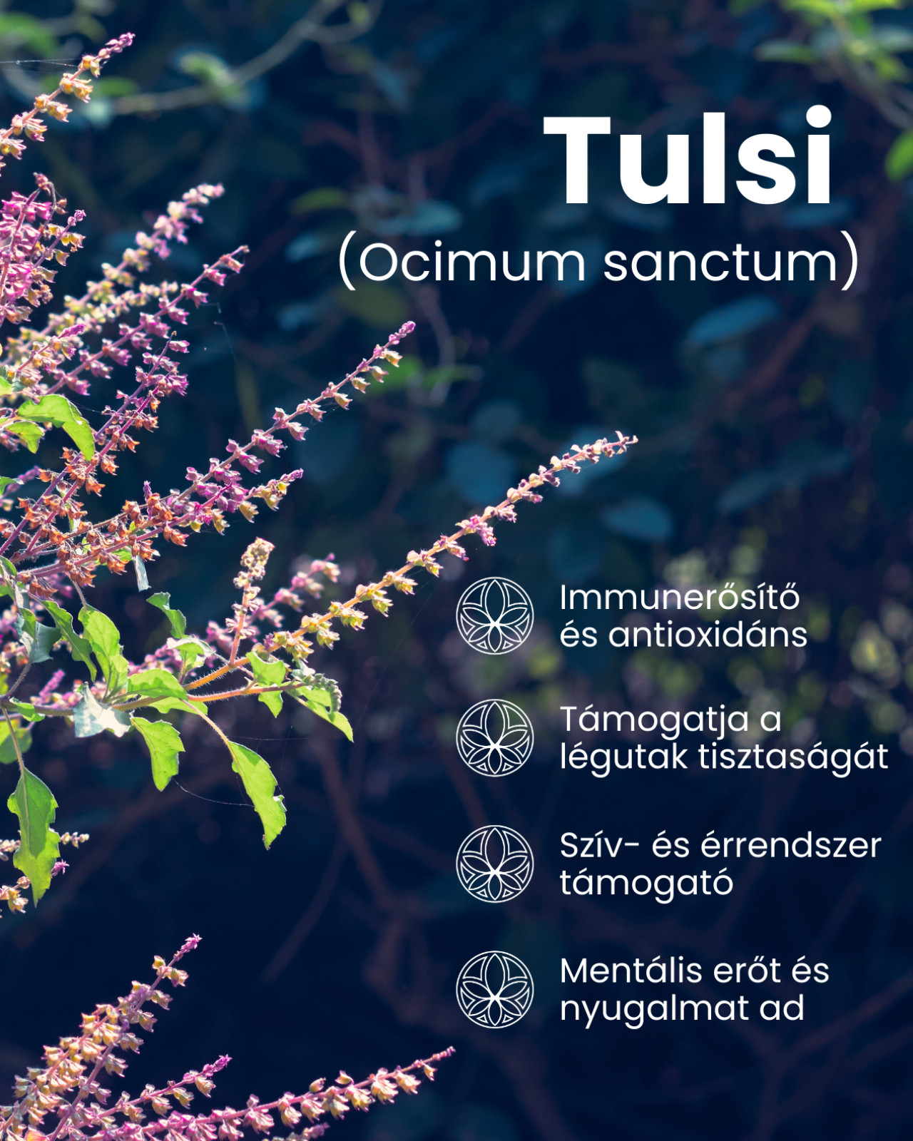 Holisztikus egyensúly és vitalitás A gyógynövény segítheti a szív- és érrendszer működését, a test természetes méregtelenítő folyamatait, valamint a normál testsúly fenntartását. Energetikai szinten a Tulsi a szívcsakra megnyitásával segítheti az együttérzés, a szeretet és a harmónia áramlását.