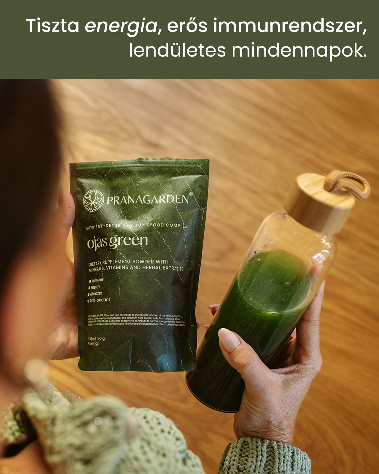 Az OjasGreen több mint 50 természetes összetevőt tartalmaz (zöldek, gyógynövények, vitaminok, probiotikumok).