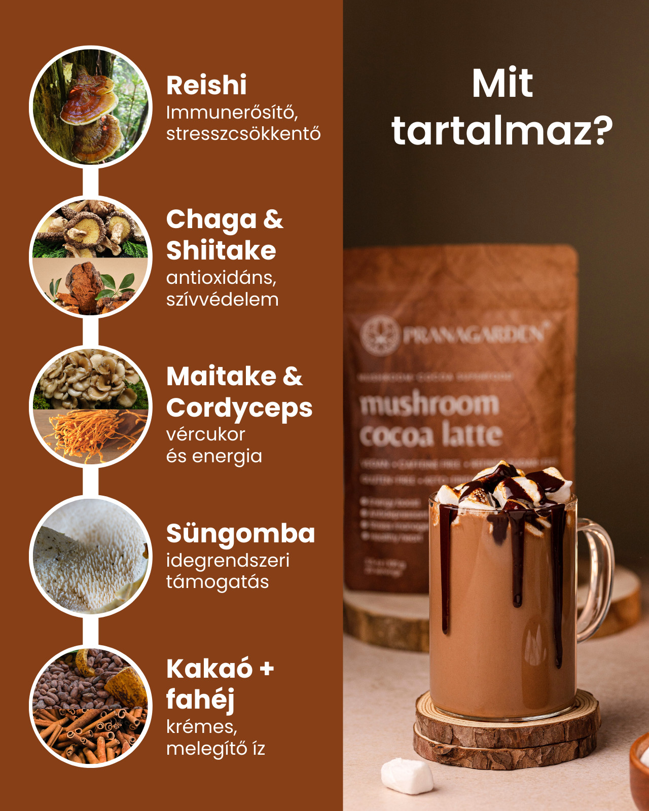 • Valódi kakaóval és adaptogén gyógygombákkal.