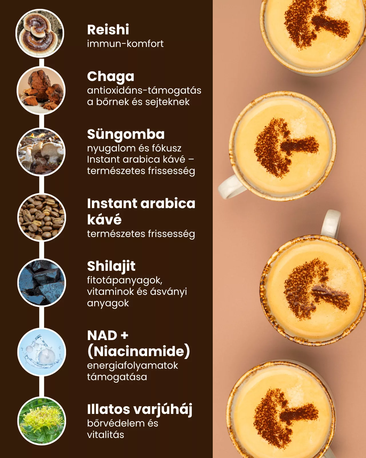 A formula instant arabica kávét, gyógygomba-kivonatokat (Reishi, Chaga, Süngomba), valamint Shilajit és NAD+ természetes forrásokat tartalmaz, amelyek innovatív módon egyesítik a tradicionális és modern összetevőket.