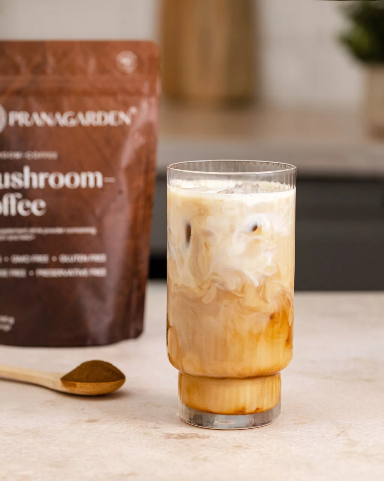 Összetevők: instant kávé (Coffea arabica) por, tömegnövelő szerek (matodextrin, gumiarábikum) shilajit (Asphaltum punjabianum) gyanta por, NAD+ (nikotinamid-adenin-dinukleotid) por, süngomba (Hericium erinaceus) termőtest kivonat, chaga (Inonotus obliquus) termőtest kivonat, reishi (Ganoderma lucidum) termőtest kivonat, illatos rózsásvarjúháj (Rhodiola rosea) gyökér kivonat.