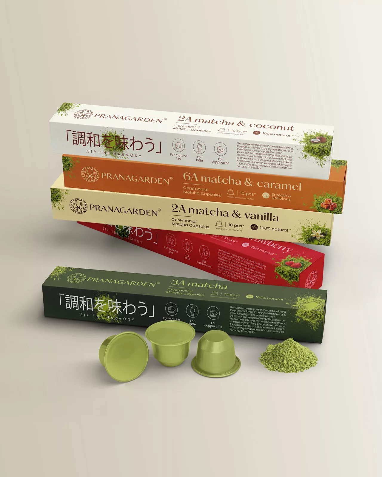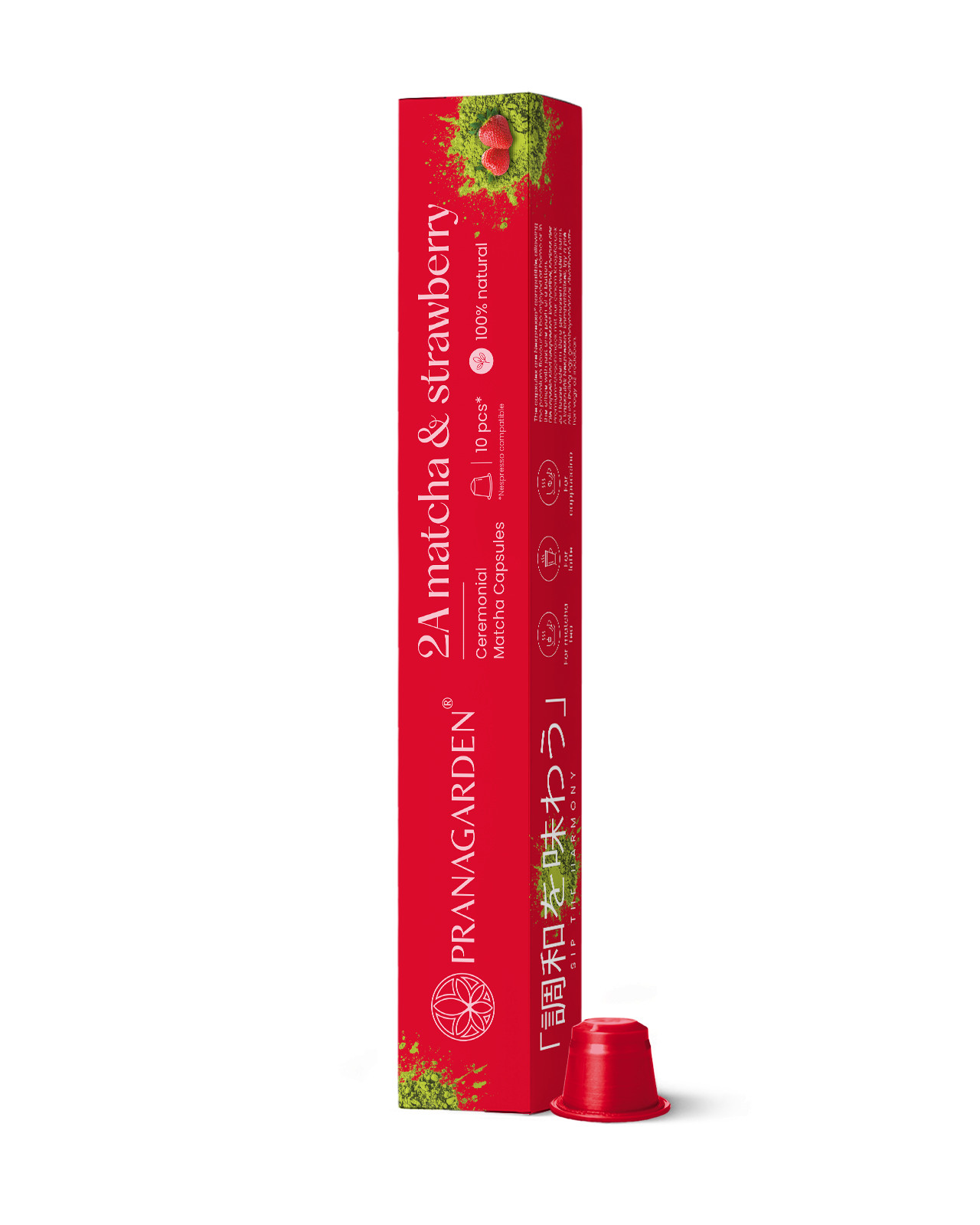 Ez a kapszula 50% finoman őrölt, 2A prémium minőségű matcha zöld teát és 50% természetes eper port tartalmaz. A matcha friss, zöld karaktere és az eper lágy, természetes édessége harmonikus egyensúlyt alkot – nem tolakodó, nem túl édes, mégis kényeztető.