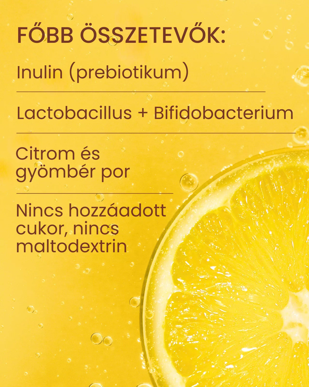 A frissítő formulában inulin, fermentált Bacillus coagulans kultúra, gyömbér, kurkuma, acerola, valódi citrom, lime és rózsaszín Himalája só található – mind természetes forrásból, adalékanyagok nélkül.