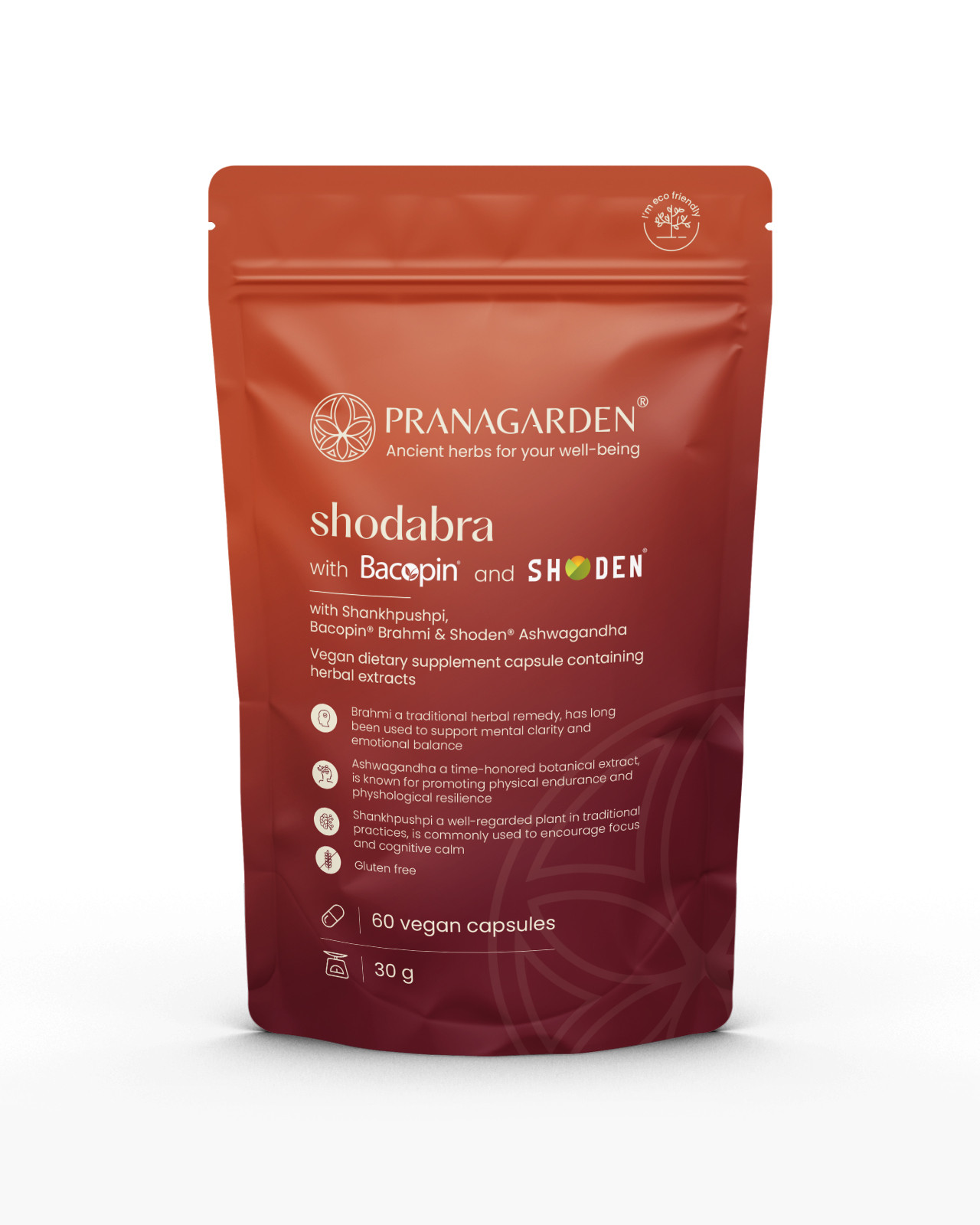 Összetevők: kapszulahéj (pullulan, szűrt víz), Shankhpushpi (Convolvulus pluricaulis) 10:1 levél kivonat, Bacopin ® Brahmi (Bacopa monnieri) levél kivonat, Shoden ® Ashwagandha (Withania somnifera) 40:1 gyökér és levél kivonat