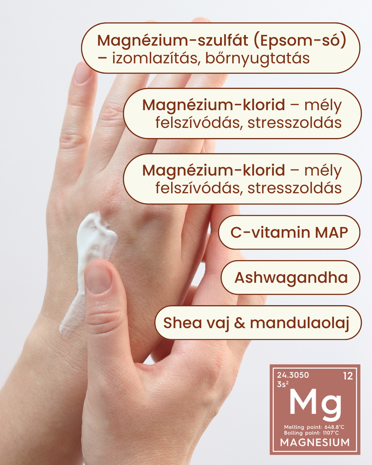 A magnézium-szulfát (Epsom-só) bőrnyugtató, pórustisztító és hidratáló hatásáról ismert, miközben hozzájárulhat az izomfeszülés oldásához és a fáradtságérzet csökkentéséhez. A magnézium-klorid a magnézium egyik legjobban felszívódó formája, amely támogatja az izmok megfelelő működését és a sejtek védelmét. A magnézium-aszkorbil-foszfát (C-vitamin MAP) antioxidáns védelmet nyújt, segíti a kollagénszintézist és a bőr feszességének megőrzését.